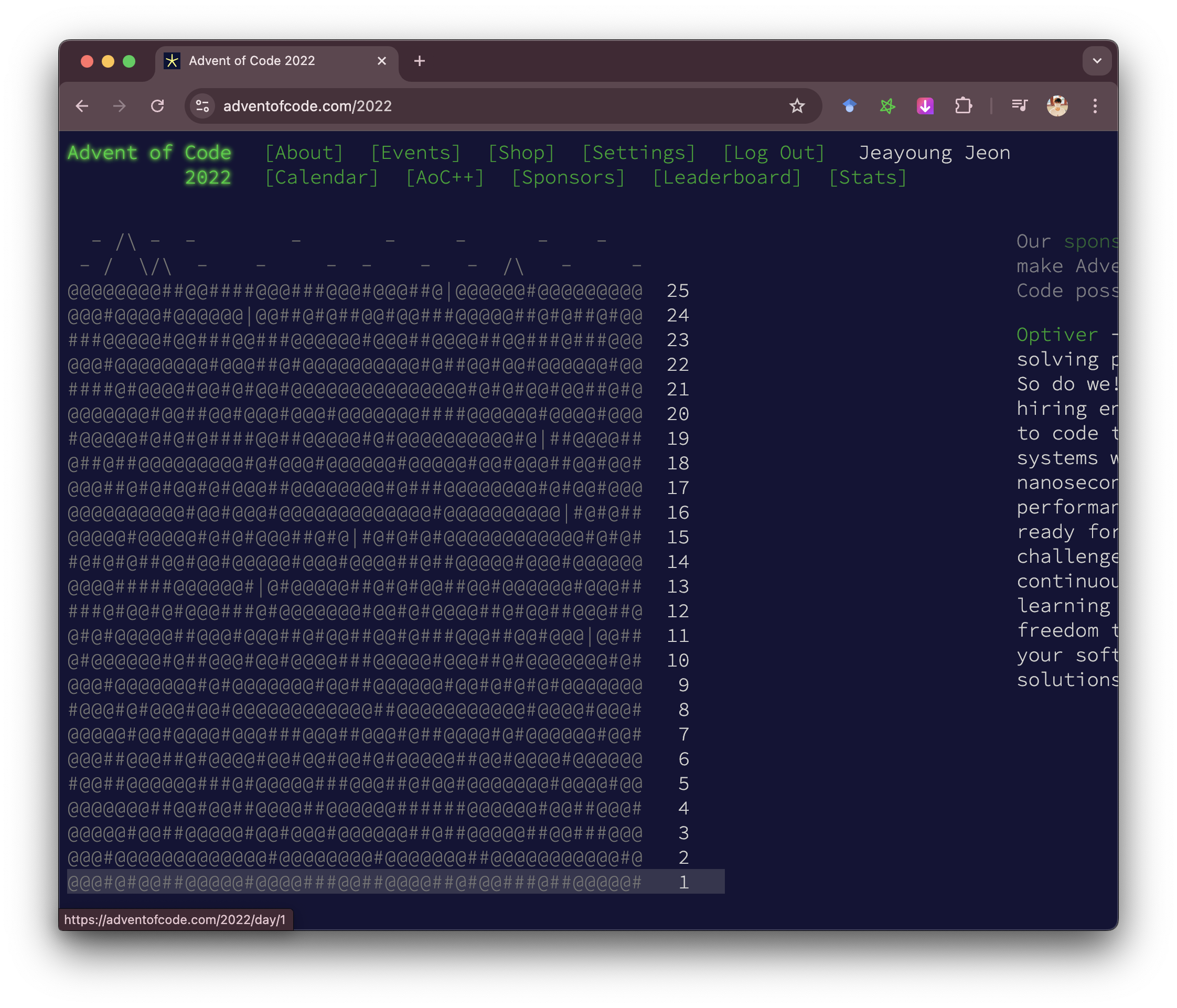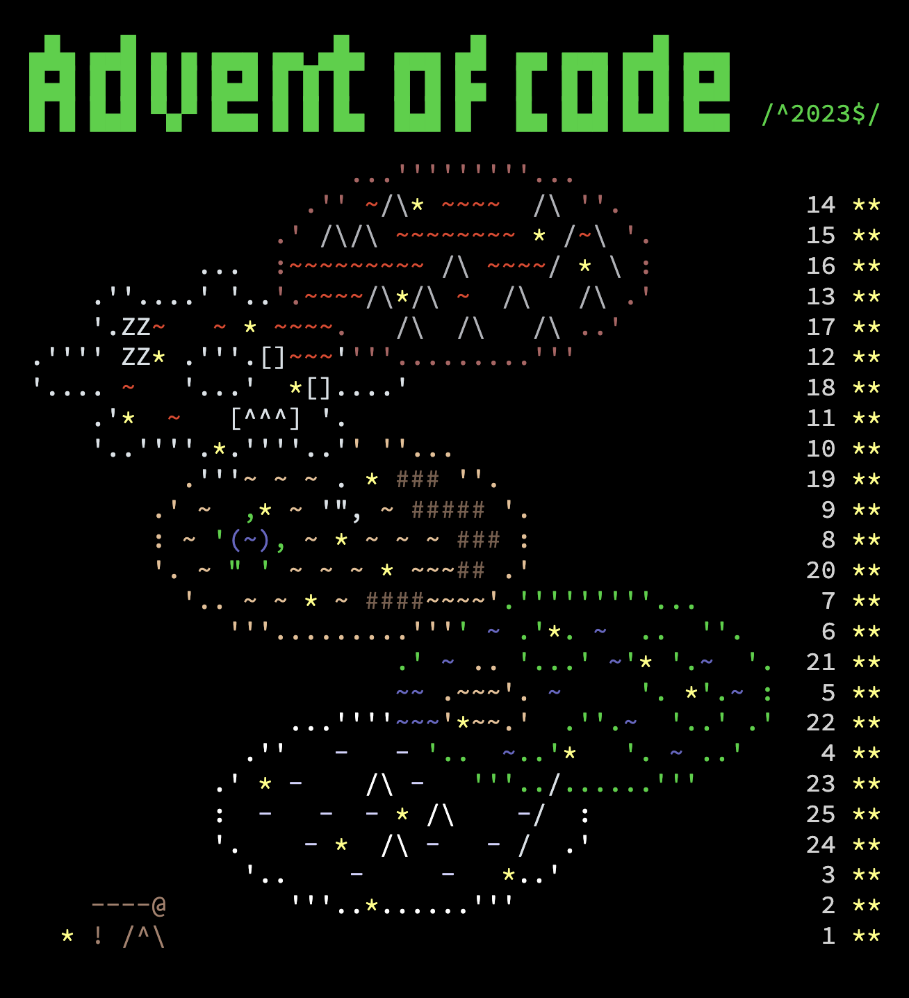 12월 1일부터 25일까지 25개의 문제를 풀 수 있습니다. 문제를 풀어가면서 아스키 코드로 만든 멋진 크리스마스 풍경을 만들 수 있어요. 빠르고 점수가 높은 100명은 리더보드에 이름을 올릴 수도 있다고 하네요.