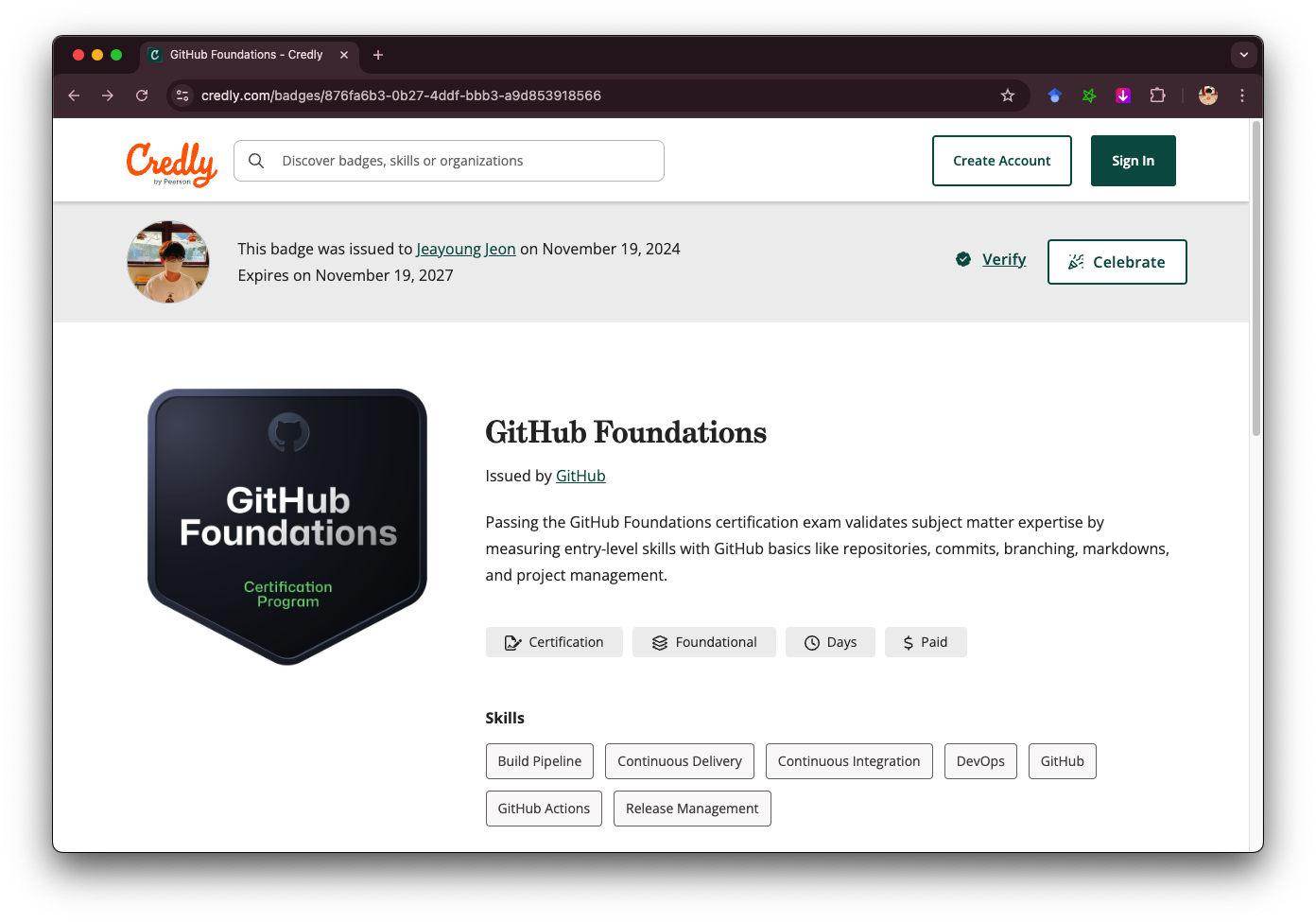저는 스킬 향상과 실력 검증을 위해 취득하였습니다. 저는 현업을 Bitbucket을 기반으로 하였고, GitHub은 개인용으로만 사용하였습니다. 그래서 GitHub을 주로 사용하는 회사에서도 빠르게 온보딩 할 수 있을거라는 바람도 있습니다.