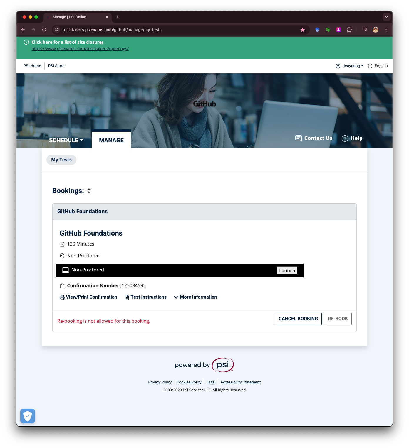 시험을 구매하셨나요? 적절한 바우처가 있다면 정가인 99달러 보다 저렴한 49달러 혹은 0달러를 지불하고 예약할 수 있습니다.. 그리고 PSI 브라우저에서 이렇게 응시가능한 화면이 나옵니다.