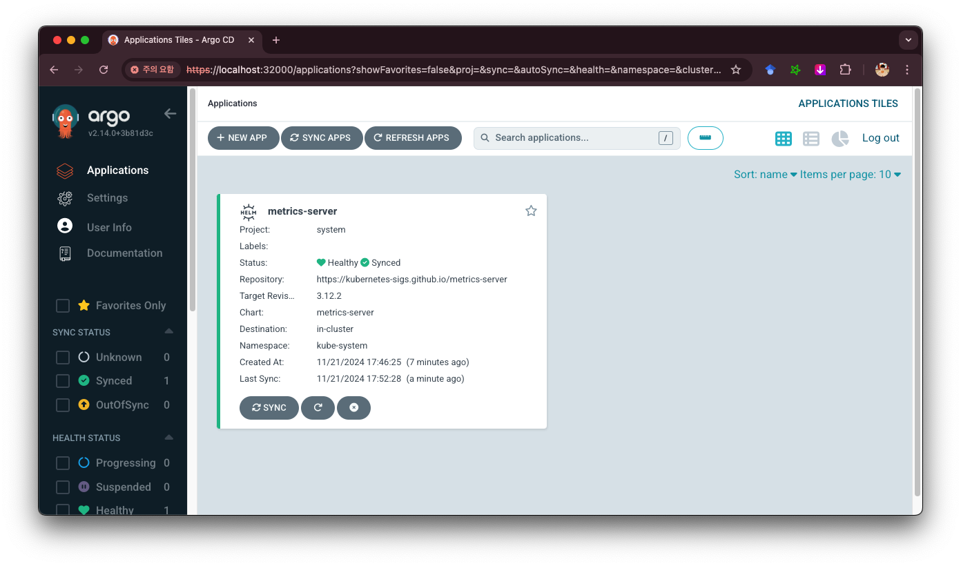 이제 Argo CD의 사용자 리소스 정의(CRD, Custom Resource Definition)를 이용해 쿠버네티스 매트릭 서버를 배포해보겠습니다. 매트릭 서버의 공식 사이트는 이 링크 입니다.