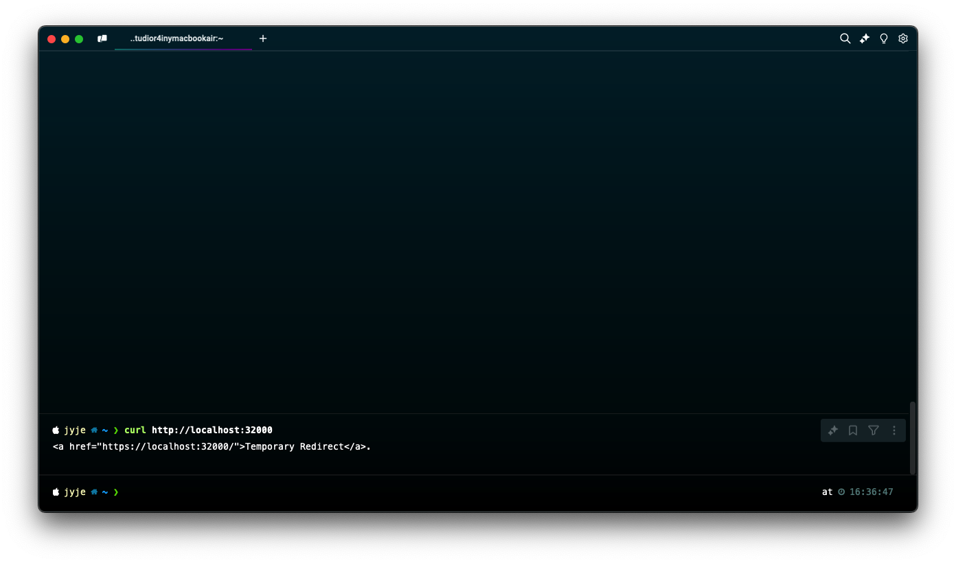 이제 브라우저에서 http://localhost:32000 으로 접속하거나 (보안 경고 무시), 터미널에서 `curl http://localhost:3200` 명령어로 서버 응답을 확인해봅니다.