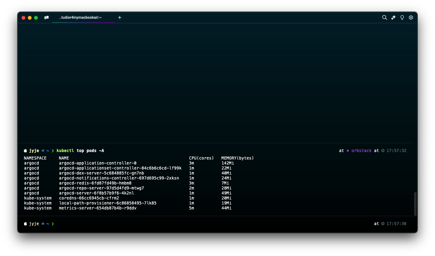 여기까지 진행하셨다면, 내가 원하는 앱의 공식 핼름 차트를 Argo CD에서 배포하여 쿠버네티스에 설치하고, 사용(kubectl top) 할 수 있습니다.