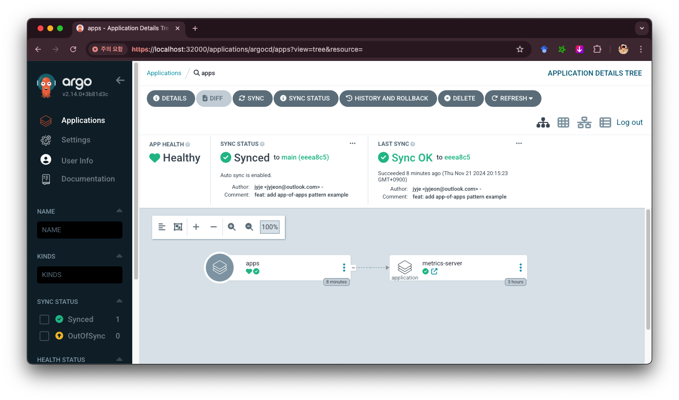 파드나 서비스같은 쿠버네티스 리소스가 아닌 apps 폴더에 있는 하위 앱을 배포하고 있습니다. 저 metrics-server 앱도 Argo CD Application 이라는 CRD이기 때문에 쿠버네티스 리소스입니다. 현재는 하위 앱이 1개 뿐입니다. git에 앱을 추가하고 5분 정도 기다리면 Argo CD가 git을 모니터링하여 추가된 리소스도 함께 배포합니다.