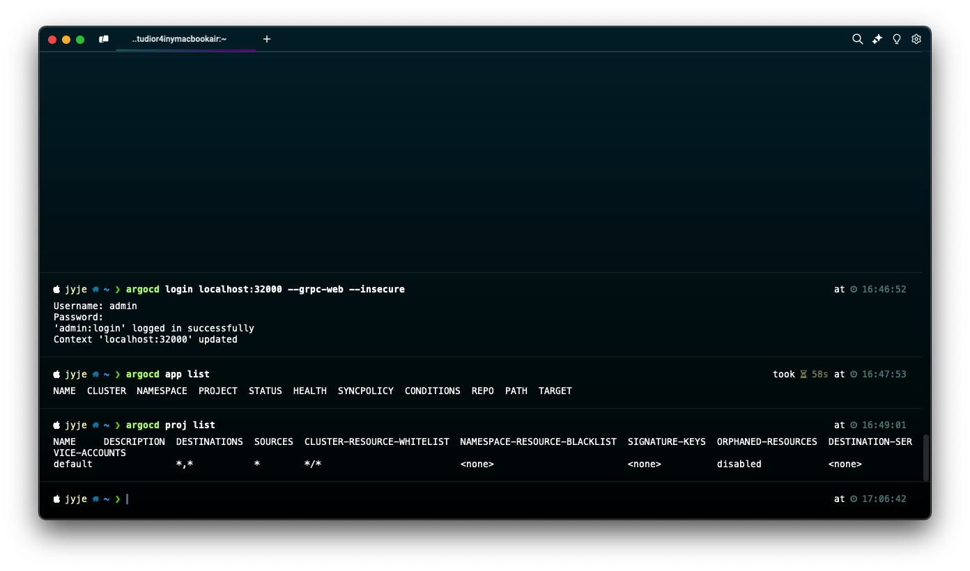 argocd login localhost:32000 --grpc-web --insecure