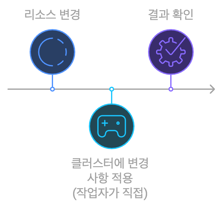 작업자의 로컬환경에서 리소스 변경 → 명령어로 클러스터에 반영 → 결과 확인 의 순서로 진행됩니다. 흐름이 간단한 만큼 빠른 결과를 얻을 수 있습니다. 프로덕션 환경에서는 개인이 모든 검증을 마치거나, 코드 리뷰를 하기 위해서 모두 작업자의 컴퓨터 앞으로 모여야 한다는 단점이 있습니다. 그 만큼 리스크가 올라가는 것이죠.