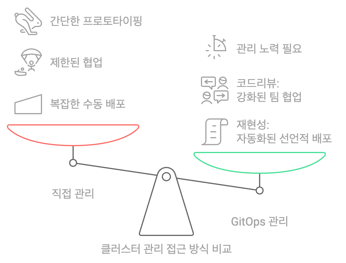 먼저 GitOps를 사용하지 않는 '직접 관리' 방식은 다음과 같습니다.