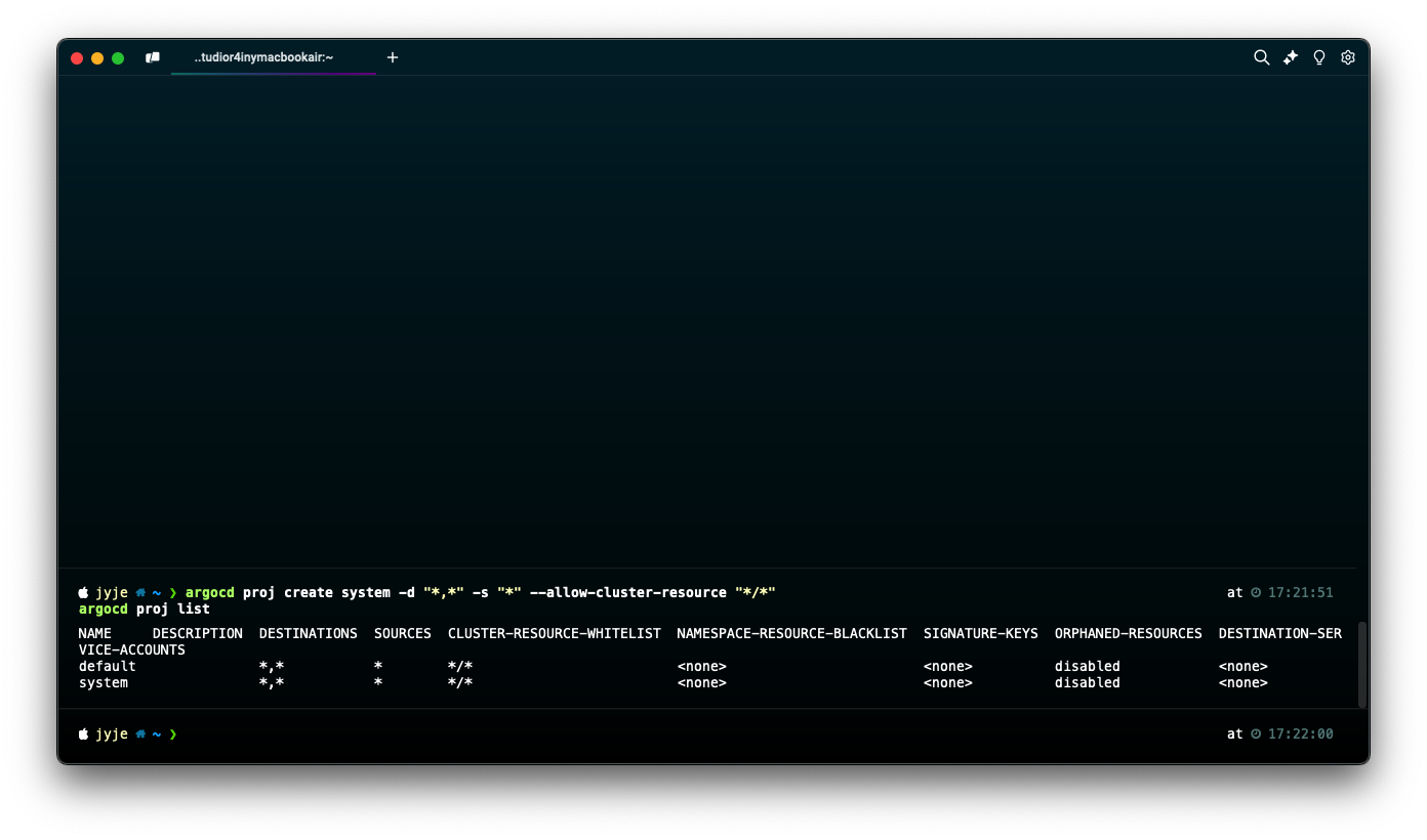 argocd proj create system -d "*,*" -s "*" --allow-cluster-resource "*/*"