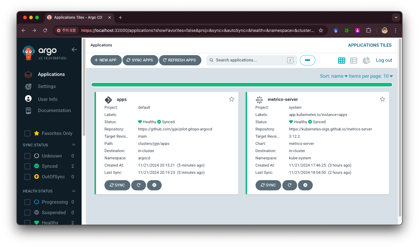 브라우저에서 Argo CD 서버에 접속하면 다음과 같이 나옵니다. Status의 Heath와 Sync에 모두 초록색 아이콘이 있는 것이 정상입니다.