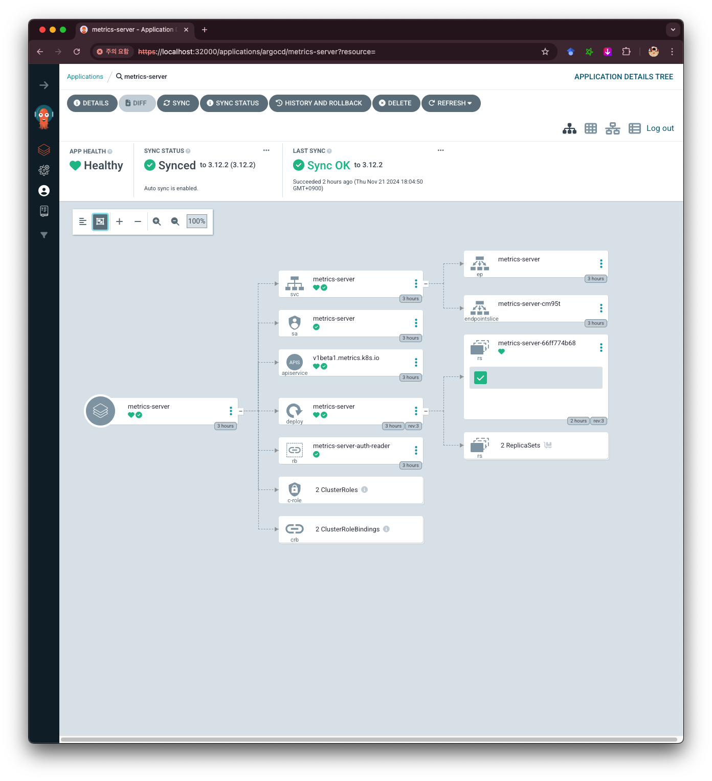 하위앱인 metrics-server를 살펴본 모습입니다.