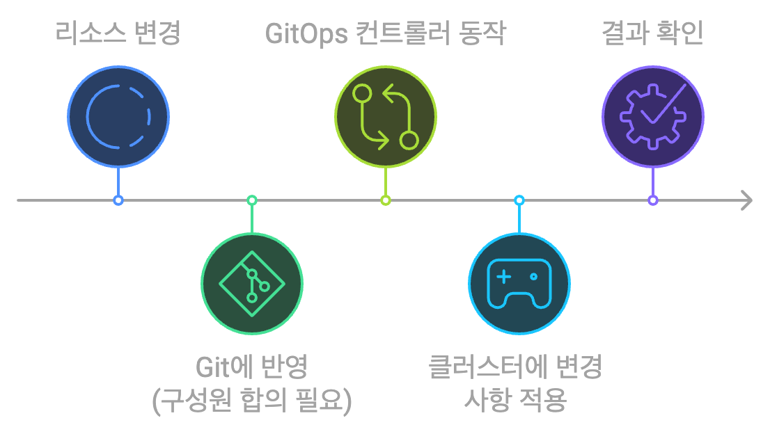 작업자의 로컬환경에서 리소스 변경 → 명령어로 클러스터에 반영 → 결과 확인 의 순서로 진행됩니다. 흐름이 간단한 만큼 빠른 결과를 얻을 수 있습니다. 프로덕션 환경에서는 개인이 모든 검증을 마치거나, 코드 리뷰를 하기 위해서 모두 작업자의 컴퓨터 앞으로 모여야 한다는 단점이 있습니다. 그 만큼 리스크가 올라가는 것이죠.