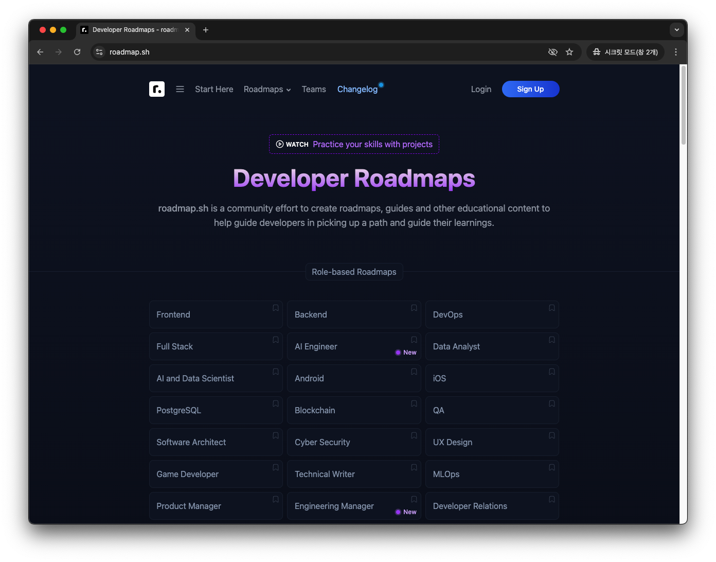 - 직군 기반, Role-based Roadmaps: 프론트엔드, 데브옵스, ML옵스, 게임 등