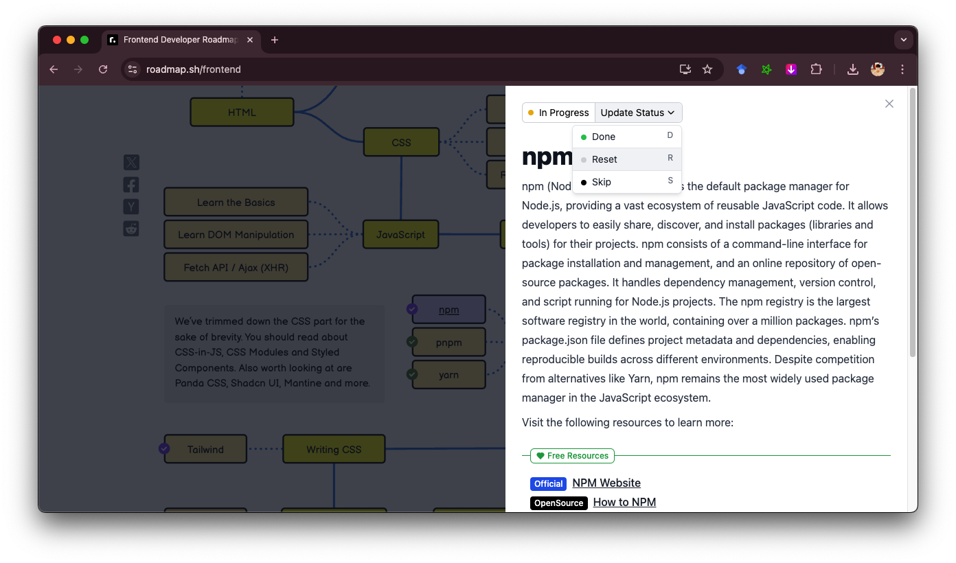 예시로 프론트엔드의 npm 토픽을 선택했습니다. 그리고 지금 배우고 있다는 뜻에서 'In Progress'를 선택했습니다.