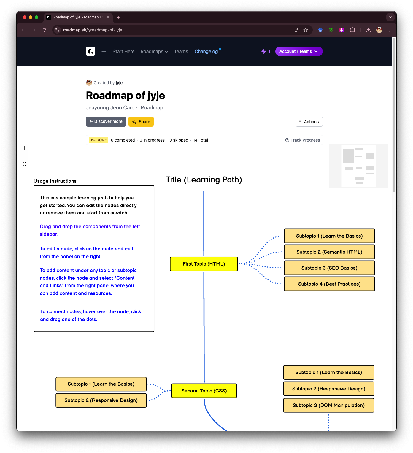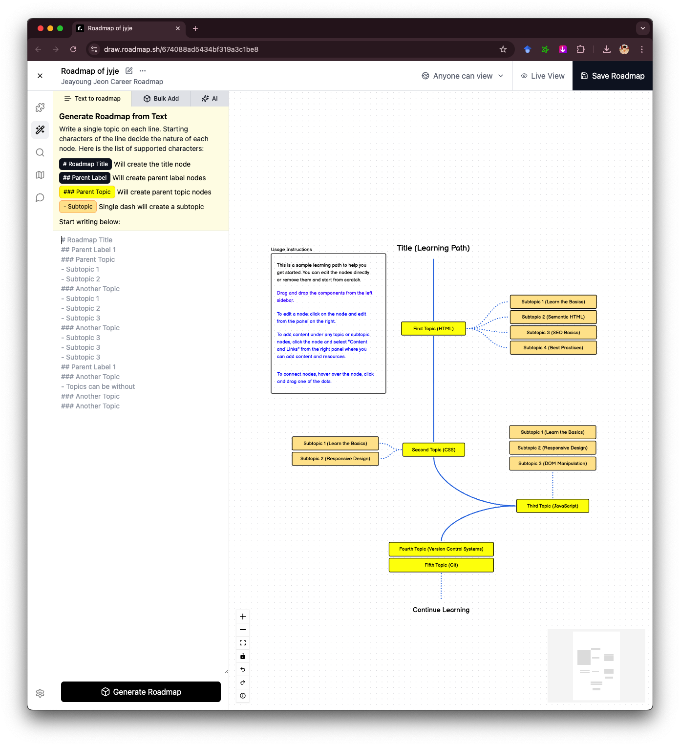 상단의 'Account / Teams' > 'Create Roadmap' 를 눌러 직접 빈 로드맵을 만들 수 있습니다. 초안을 잡기 위해서는 2번째 탭인 'Generate Roadmap from Text'로 마크다운을 작성하고, 그 1번째 탭에서 꾸미는 걸 추천합니다.