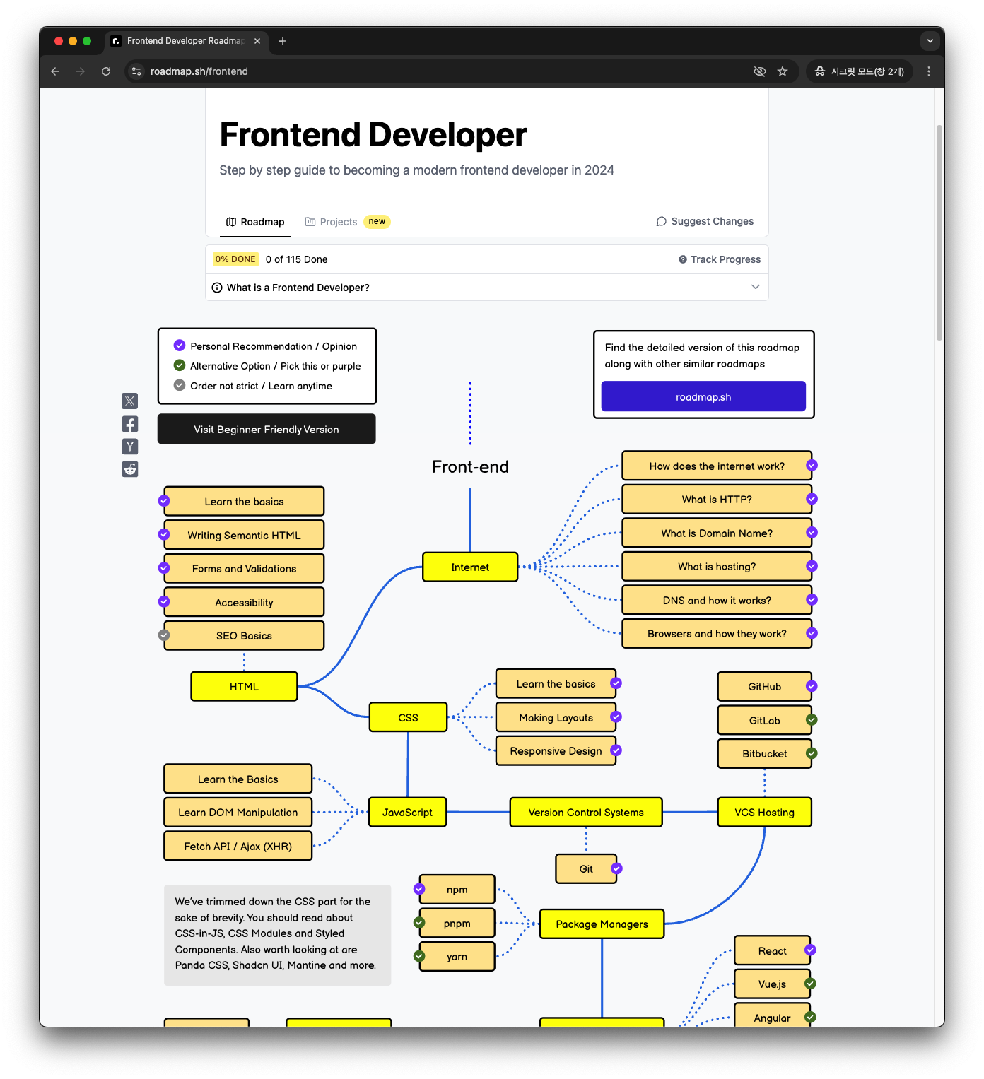 여기서는 궁금한 직군을 클릭해봅시다. 제일 처음의 프론트엔드 개발자를 누르면 2024년 11월 22일 기준 다음과 같이 구성되어 있습니다. (로드맵은 계속 업데이트 되고 있습니다)