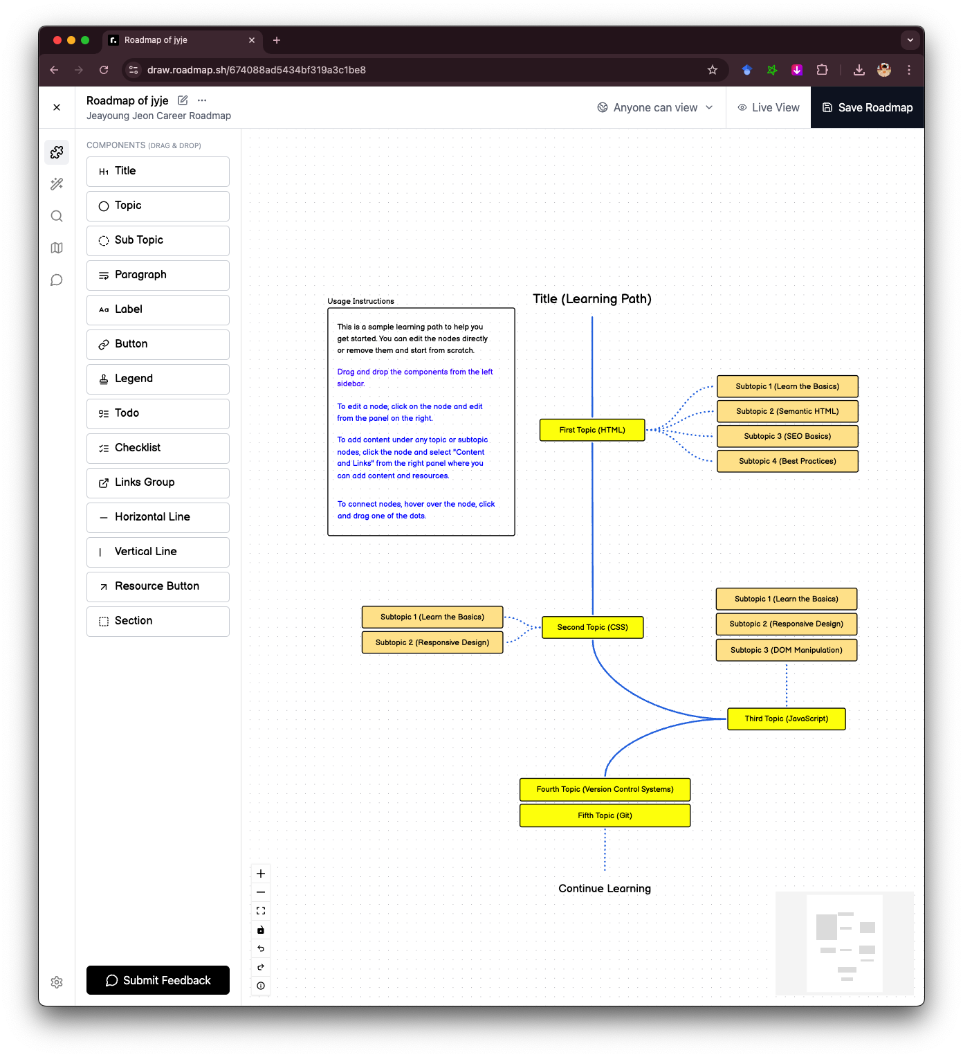 로드맵은 혼자 보아도 좋습니다. 또, 멘토링을 하거나 팀의 방향을 정하기 위한 자료로 쓰기에도 좋습니다.