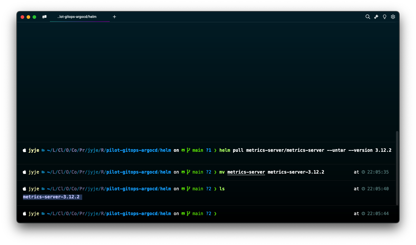 이전 포스팅과 마찬가지로 k8s 메트릭 서버를 예시로 하겠습니다. GitOps 소스코드는 이 링크를 참조해 주세요. 먼저 리포지토리에 `helm` 폴더를 하나 생성합니다.