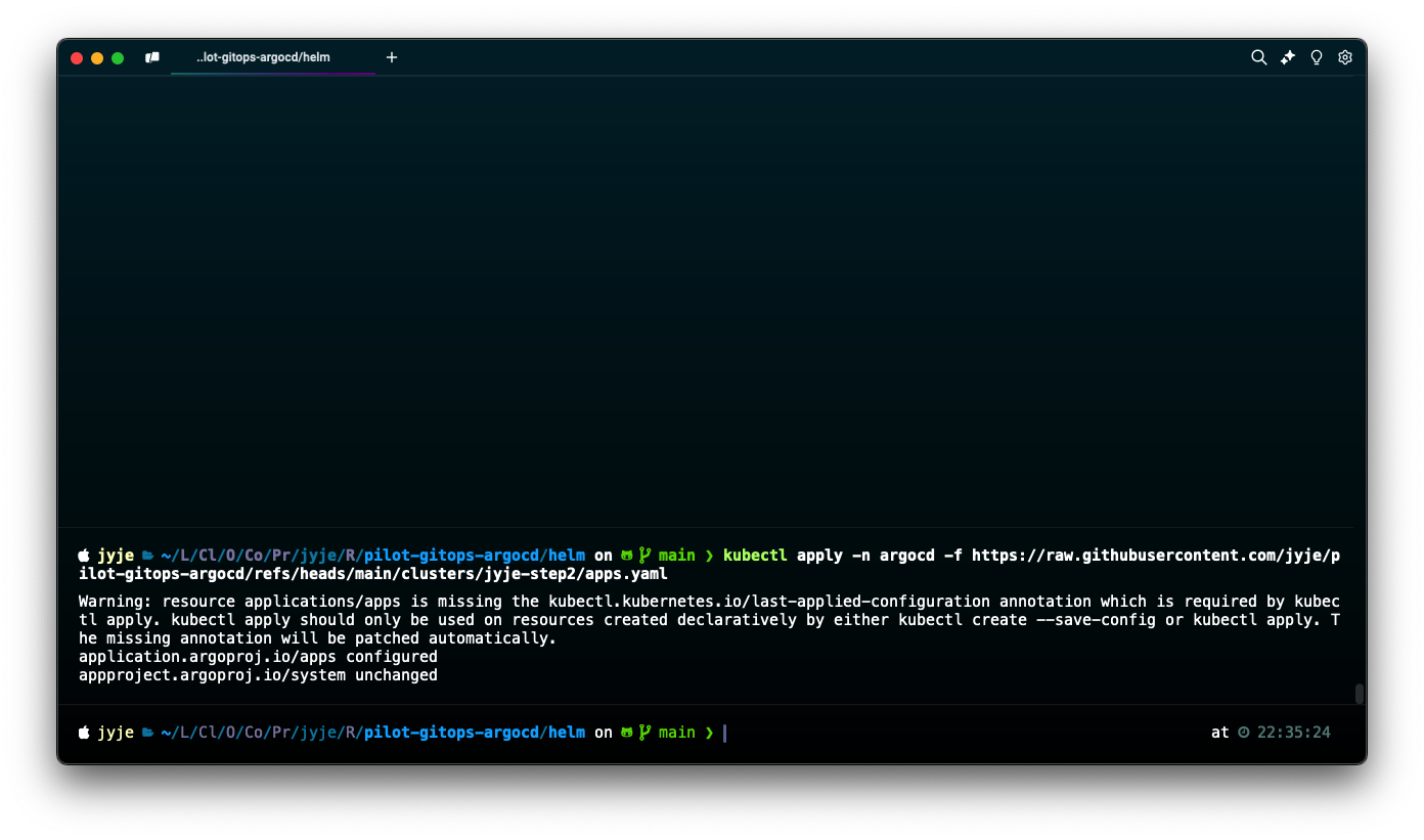 kubectl apply -n argocd -f https://raw.githubusercontent.com/jyje/pilot-gitops-argocd/refs/heads/main/clusters/jyje-step2/apps.yaml