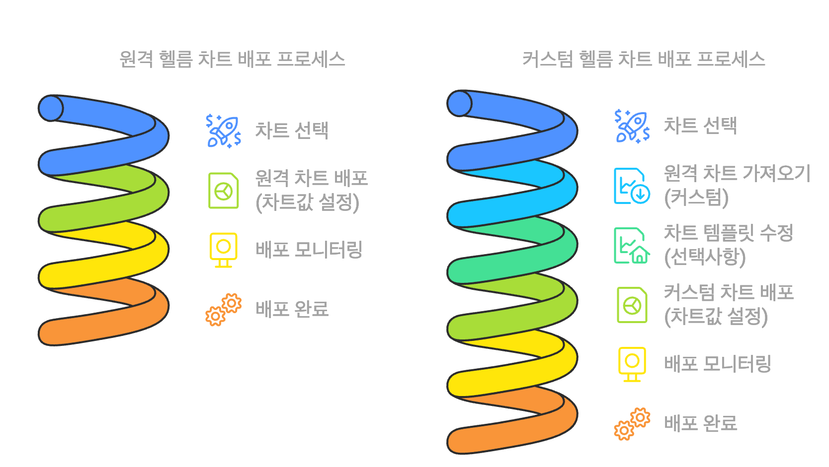 이 블로그에서 정의한 커스텀 차트 배포는 원격 차트를 내 git에 내려받고 그 차트를 배포하는 GitOps 방식입니다. 원격 헬름 차트 배포와 비교하여서 `원격 차트를 가져오는 과정`과 `차트 템플릿을 수정하는 과정`이 추가됩니다.