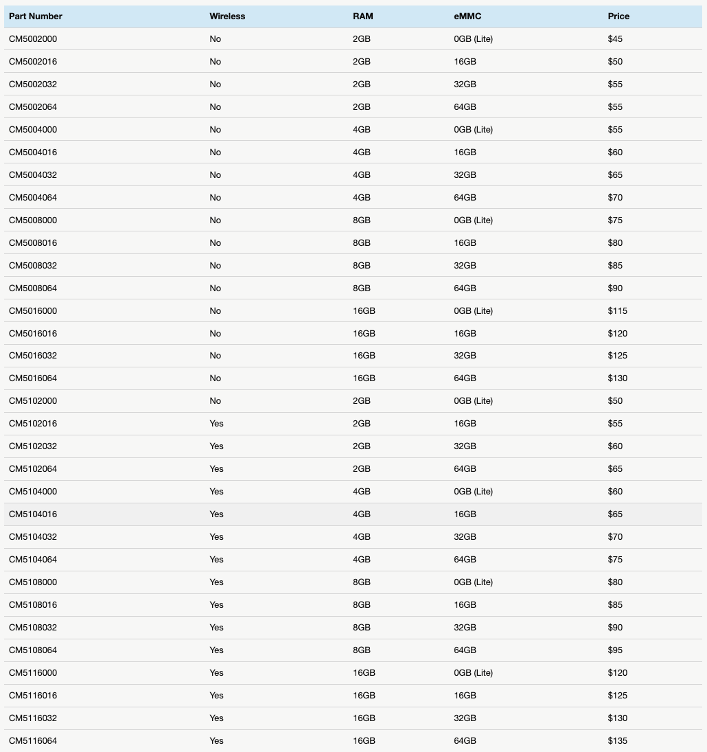 이번에 출시한 CM5의 가격은 $45부터 $135까지 다양한 선택지가 있습니다. 개인적으로 가장 주목할 부분은, 메모리 사용량이 늘어나면서 CM4의 최대 8GB 보다 큰 CM5의 최대 16GB 메모리를 제공하고 있습니다. 대신 가격은 $115부터 시작합니다. 한국에서는 15-17만원으로 예상합니다. 점점 착한 보드 😇 에 착하지 않은 가격 😈 이 되고 있습니다.