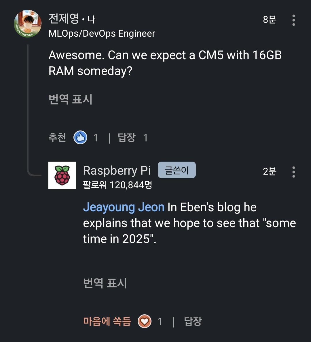 특히 라즈베리파이에서 경량의 SLM(sLLM) 모델을 돌리려면, 8GB 메모리로 부족한 경우가 많았습니다. 16GB 메모리까지 지원한다면 업계에서 IoT 기반 온디바이스 AI를 개발하는데 많은 도움이 될 거 같습니다.