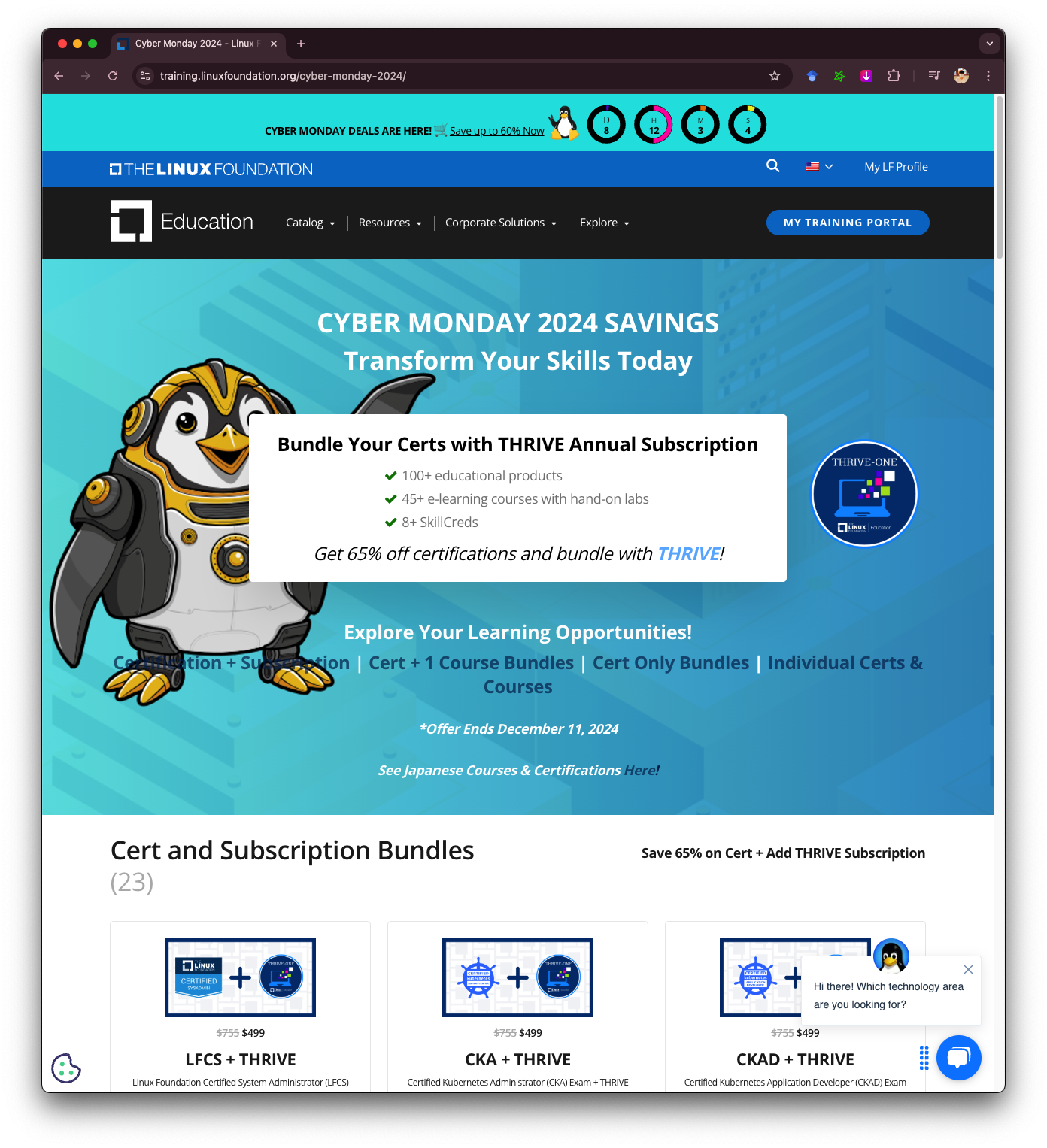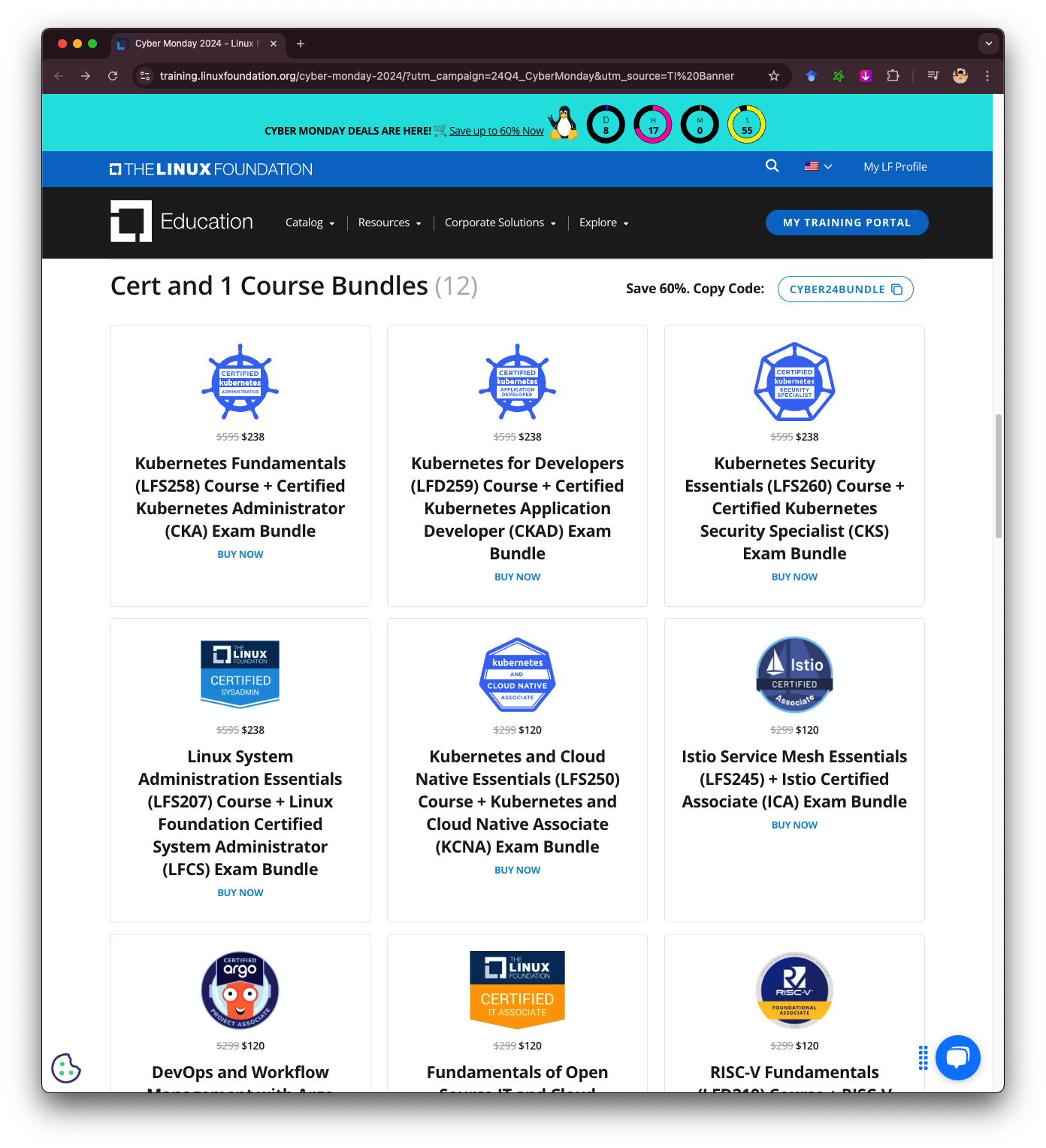 안녕하세요. 지난 주 11월 29일 블랙프라이데이가 지나고 12월 2일부터 사이버 먼데이가 찾아왔습니다. 리눅스 재단의 행사 사이버 먼데이는 한국시간 기준 2024년 12월 11일 오전 11시 40분까지 리눅스 재단 및 CNCF 기술 강의와 자격증을 최대 60% 할인하는 연중행사입니다. 자기개발을 위해 자격증을 노리는 개발자들에게 매우 유용한 연말행사입니다. 쿠버네티스 관련 자격증은 600달러로 매우 비싸기 때문에 회사의 지원이 없다면 번들 할인 + 사이버 먼데이를 노리시는게 무조건 좋습니다. 이 블로그에서는 사이버 먼데이와 자격증 응시권 구매 팁을 소개합니다.
