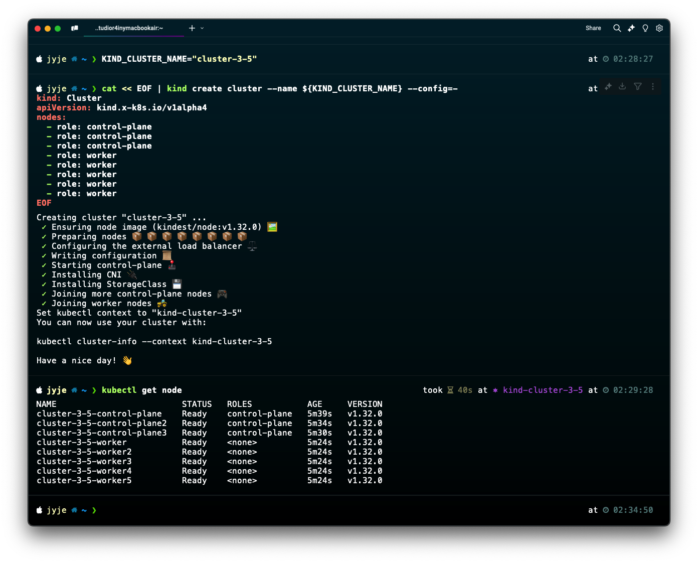 3개의 컨트롤 플레인, 5개의 워커노드를 구성하는 명령어 입니다. YAML을 저장하고 불러올 필요없이 STDIN 방식으로 간편하게 만들 수 있습니다. 다음 명령어를 한번에 실행해주세요: