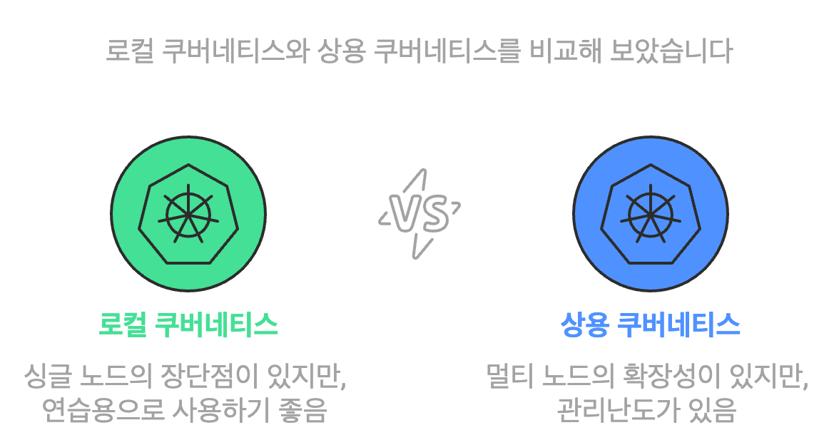 - 커스텀 제약: 로컬 클러스터에저 제공하는 커스텀 안에서만 가능합니다 → 필요하다면 상용 쿠버네티스로 전환.